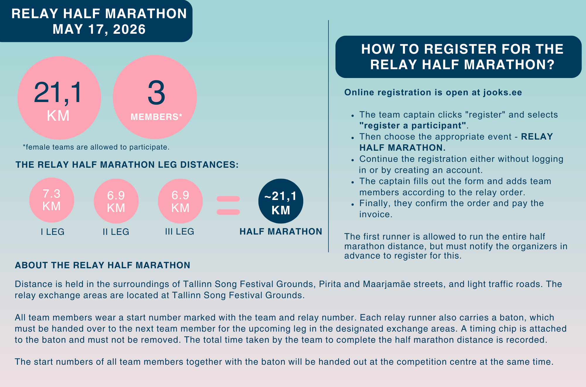 | Relay half marathon 21K | 100 € | 120 € | 150 € |