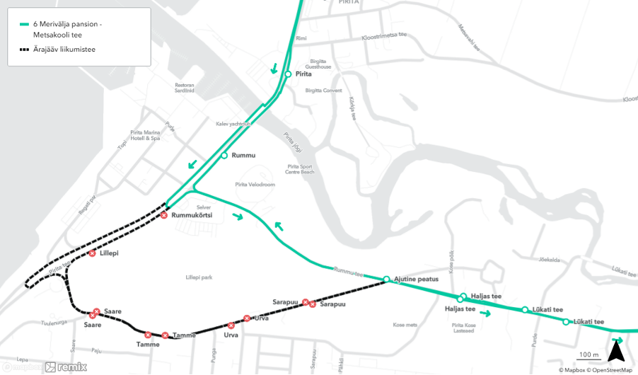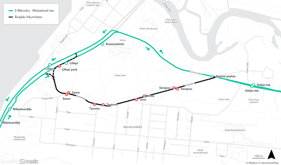 In the direction of Metsakooli tee: Lillepi, Rummukõrtsi, temporary stop on the intersection of Kose tee / Rummu tee