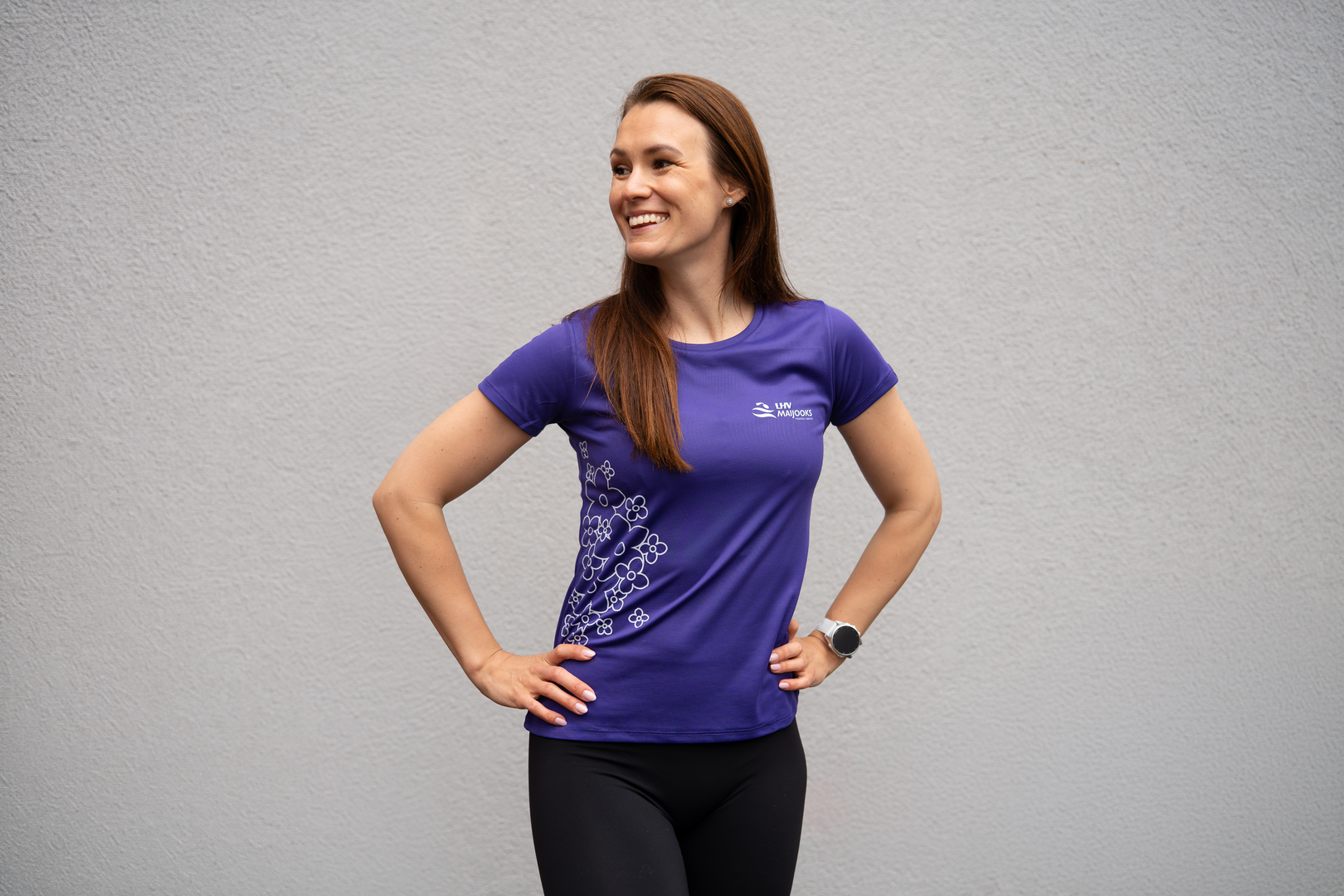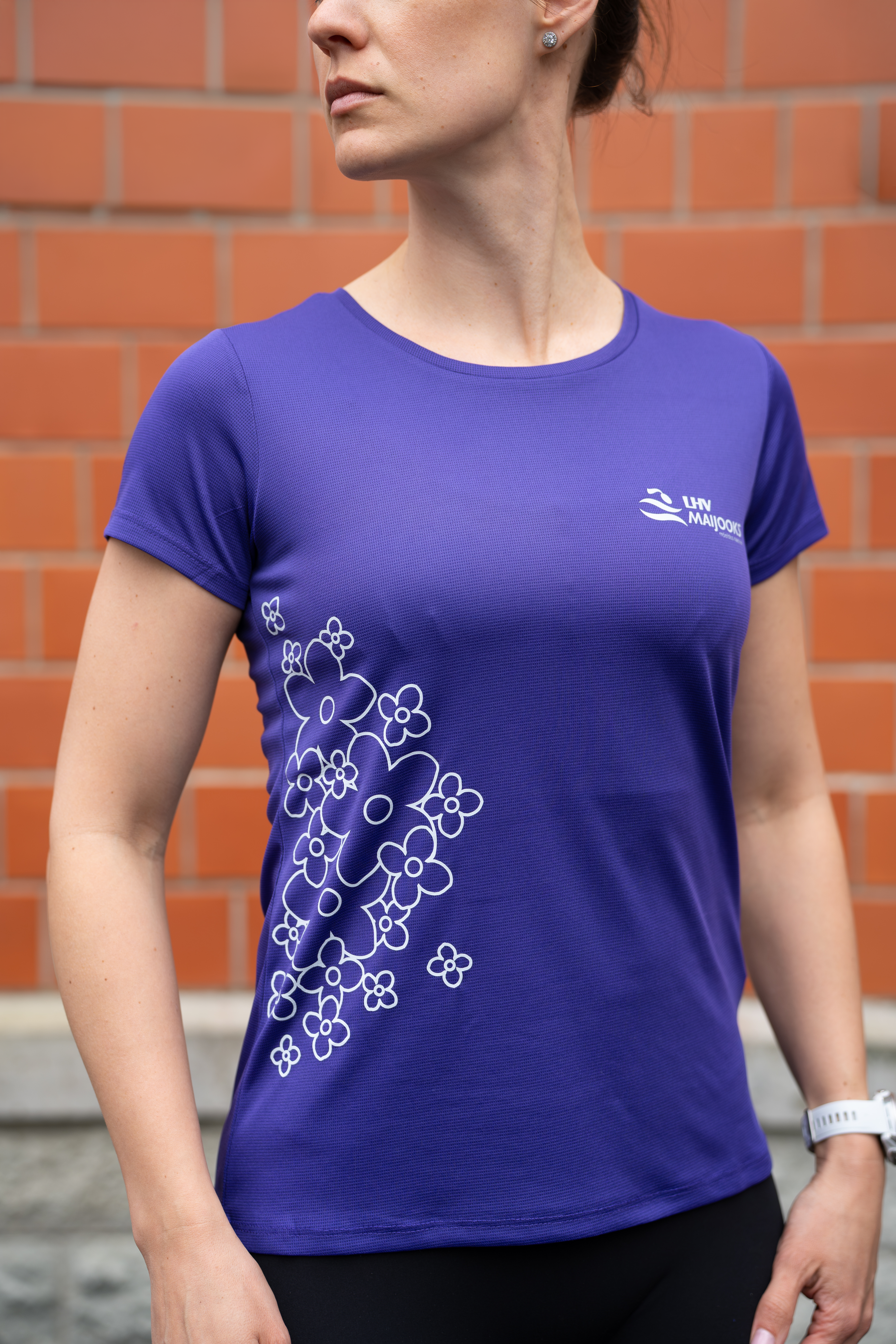 Tyylikäs tummanvioletti paita, jota koristavat herkät syreeninkukat, tuo radalle keväistä tunnelmaa – ja on suunniteltu niin, että tunnet olosi mukavaksi ja itsevarmaksi liikkuessasi. Rinnassa oleva LHV Maijooks -logo symboloi yhteistä liikkumisen iloa ja sitä ainutlaatuista tunnetta, jonka koet juostessasi tuhansien naisten kanssa.